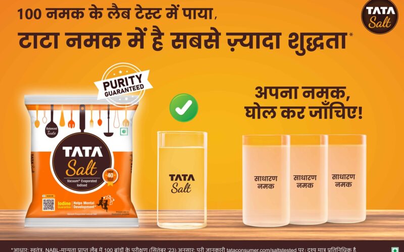 २०२३ मा गरिएको राष्ट्रव्यापी स्वतन्त्र दाबी परीक्षण अध्ययनमा १०० ब्रान्डहरूमध्ये टाटा साल्ट शुद्धतामा सबैभन्दा उच्च स्थानमा उभिएको छ, जसले भारतको आयोडिनयुक्त नुन क्षेत्रमा आफ्नो नेतृत्वलाई सुदृढ पारेको छ। प्रयोगशाला उत्पादन परीक्षणले ब्रान्डलाई प्रतिस्पर्धात्मक FMCG श्रेणीमा शुद्धता र प्रामाणिकताको मापदण्डको रूपमा स्थापित गर्दछ, जहाँ गुणस्तर प्रमुख फरकका रूपमा प्रस्तुत हुन्छ।